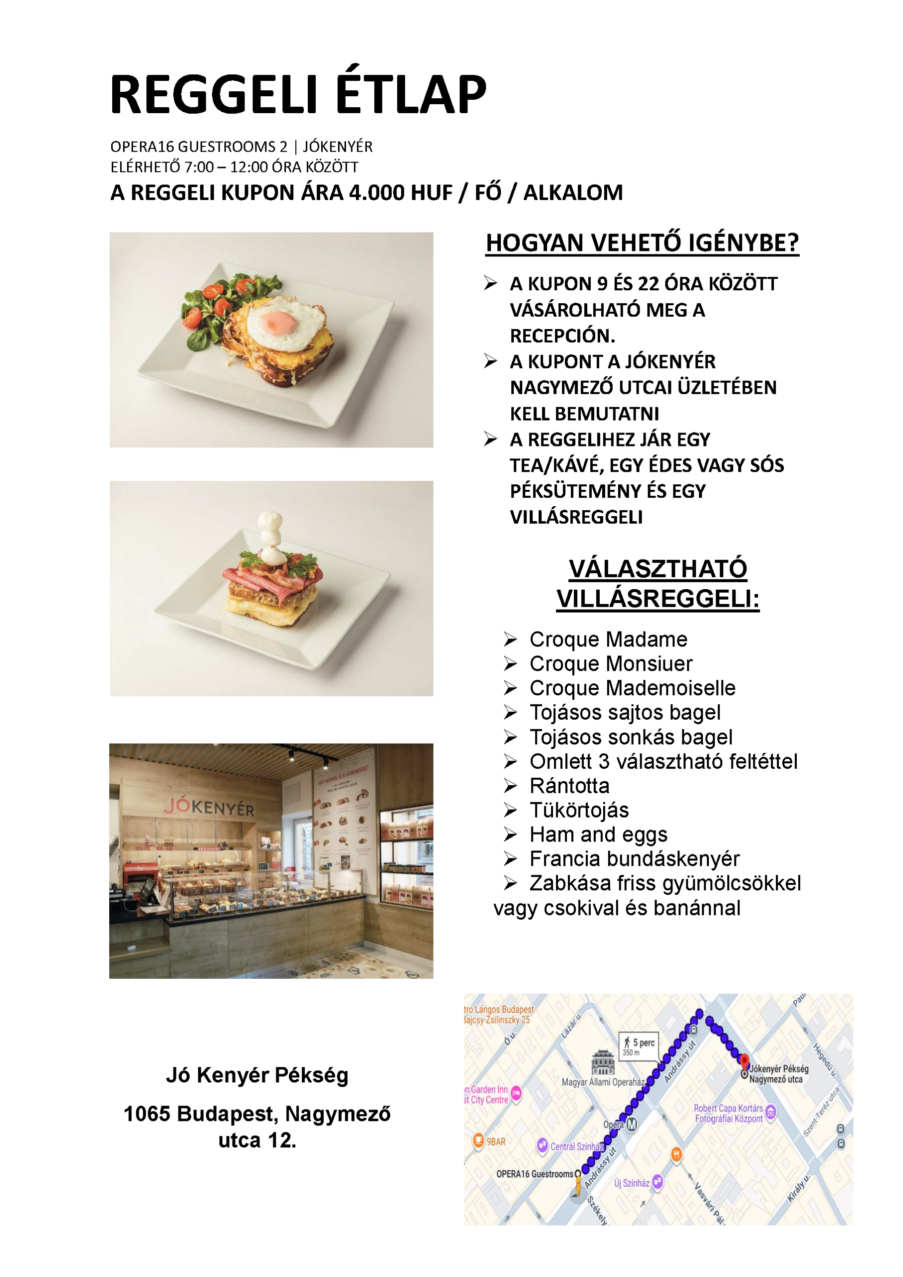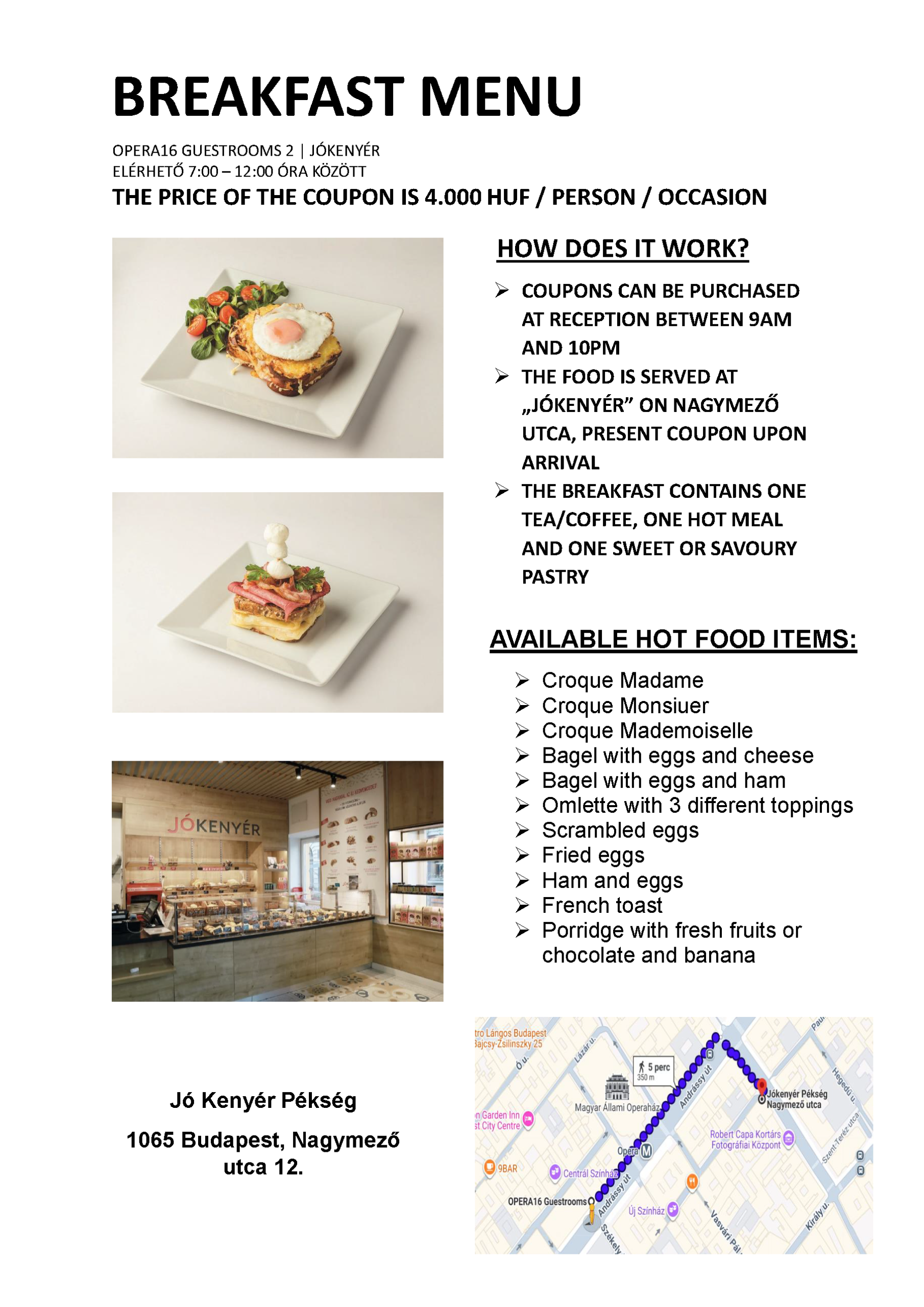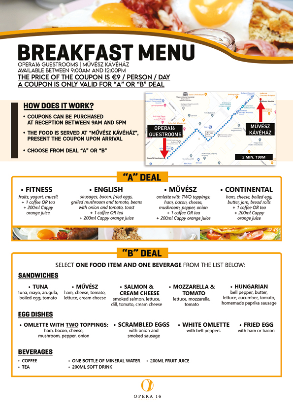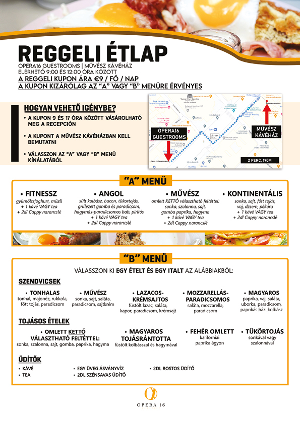 A reggeli kupon ára 4.000 HUF / fő / alkalom. A reggeli kupon a recepción vásárolható meg 9 és 22 óra között. A reggeli tartalmaz egy teát/kávét, egy villásreggelit és egy péksüteményt. Kérjük kattintson a lenti képre a részletes étlapért.